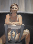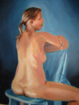 2007Vrouwlijk naakt op een stoel van achter gezien. Overwegend blauw.